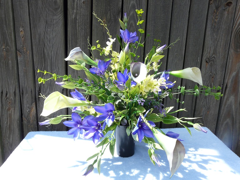 Bukiet nagrobny w wazonie z obciążeniem z niebieskimi sztucznymi kwiatami. Wymiary ok. 60 x 60 cm.