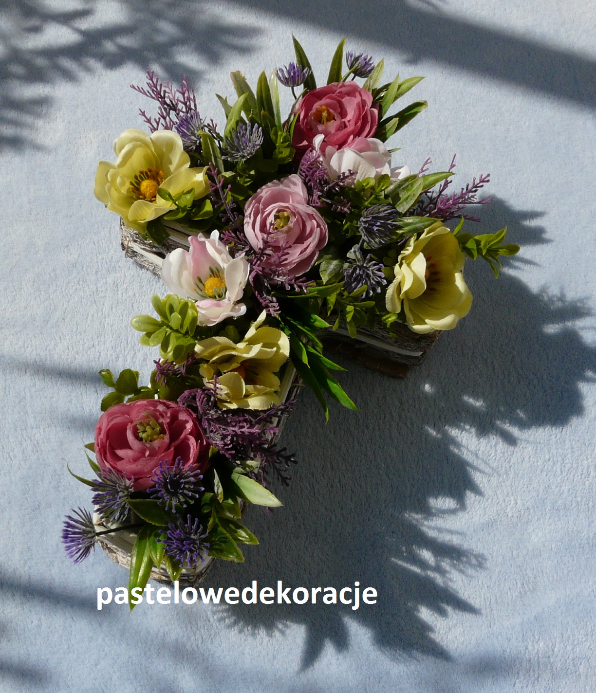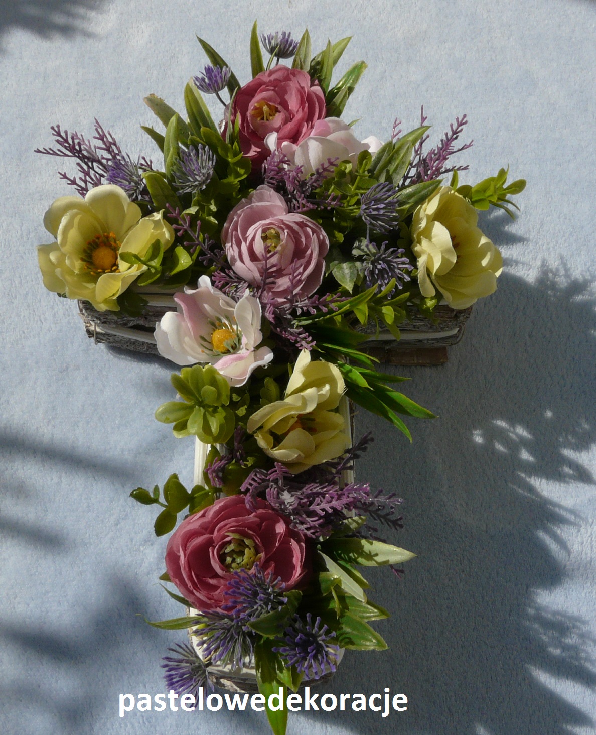 Dekoracja/stroik w formie krzyża została wykonana z wysokiej jakości kwiatów w pojemniku w kształcie krzyża z obciążeniem (gips). Idealna do położenia na mniejszym nagrobku. Wymiary krzyża to 30cm x20cmx 10cm.