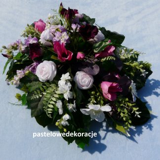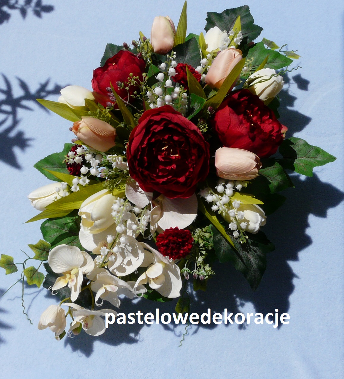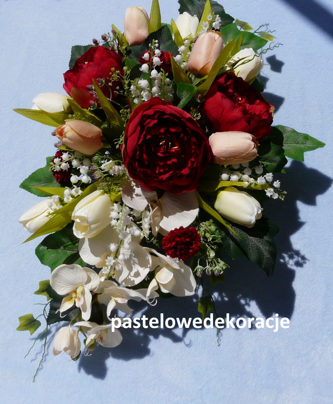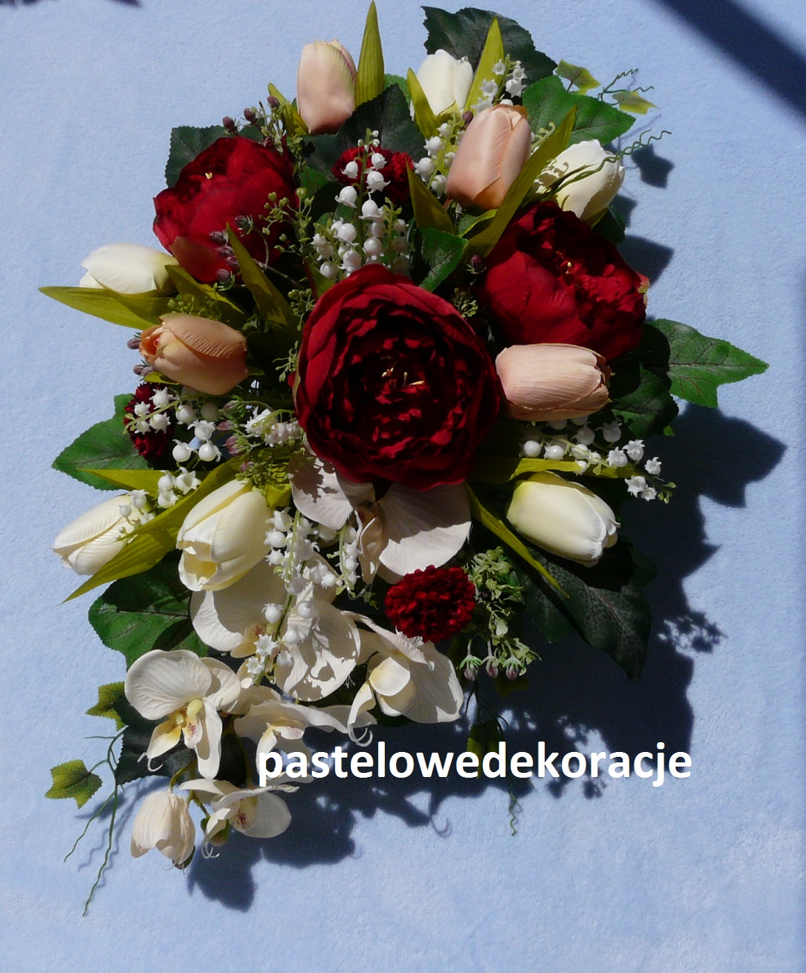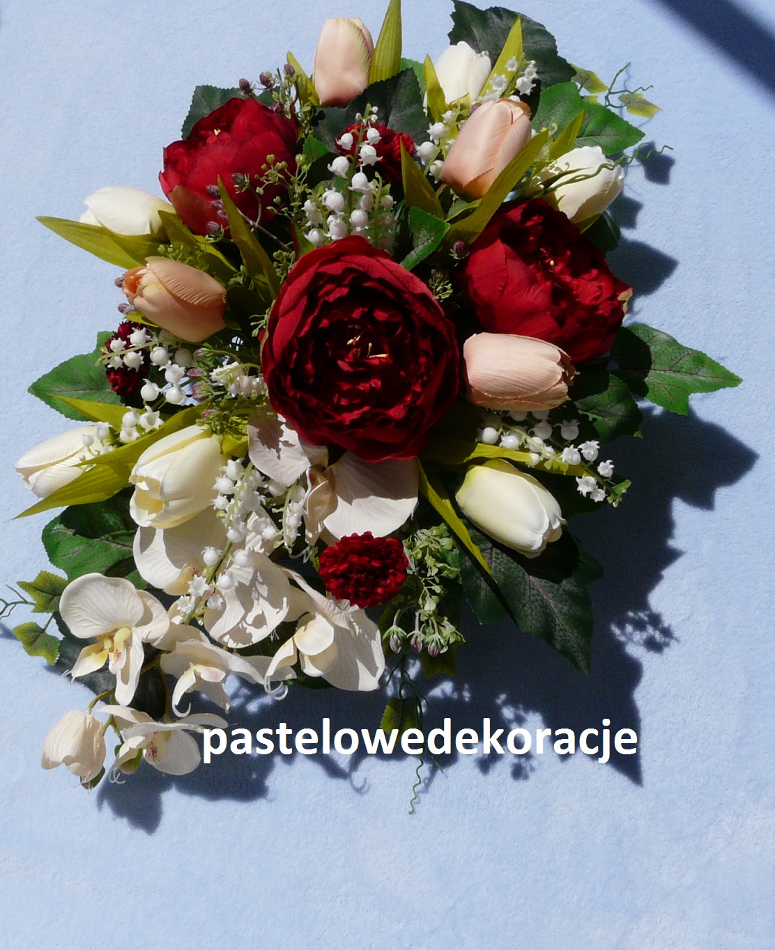 Dekoracja nagrobna o wymiarach 66x48x28 cm, wykonana w solidnej podstawie zabetonowanej z peoniami, konwaliami, tulipanami i innymi dodatkami.
