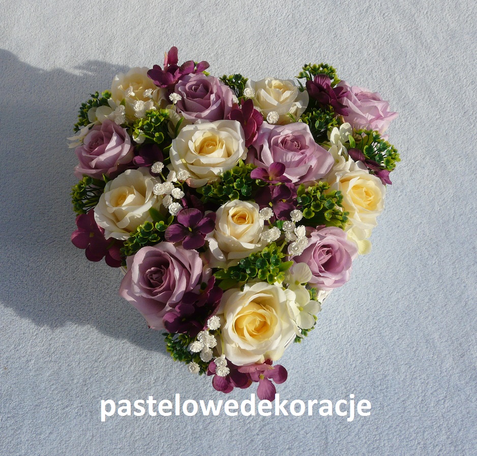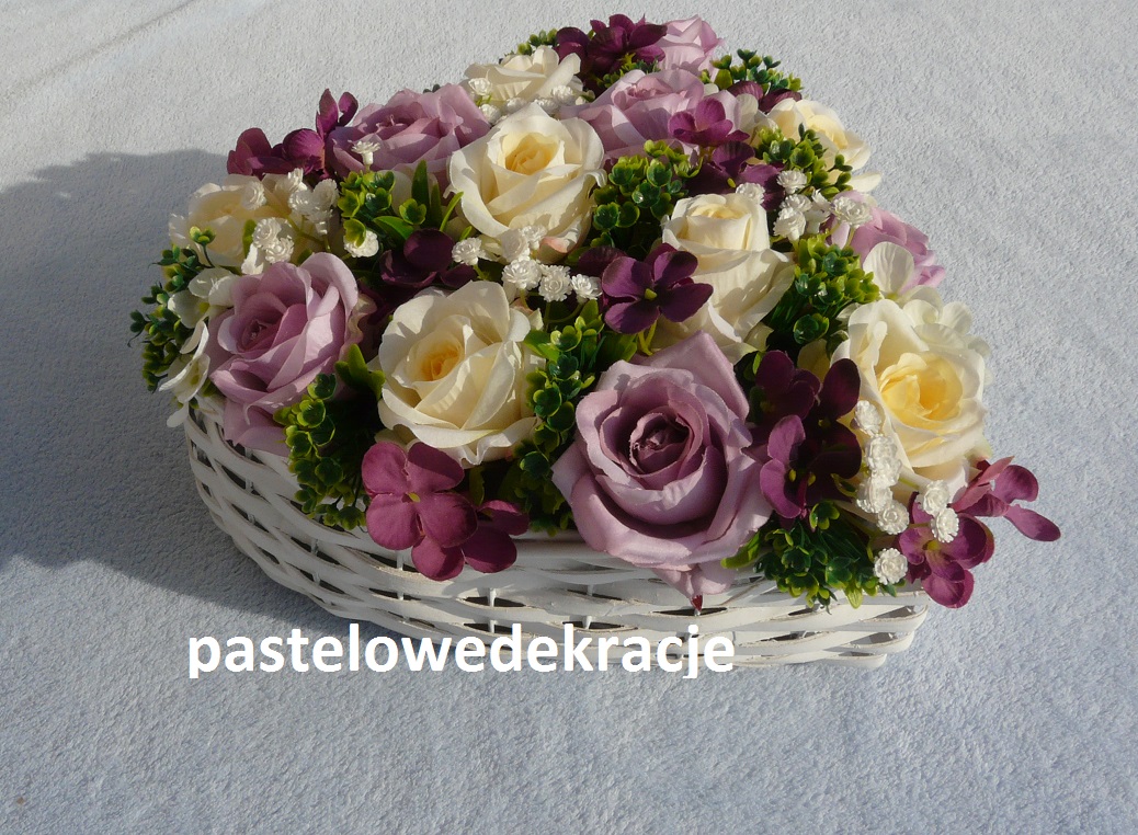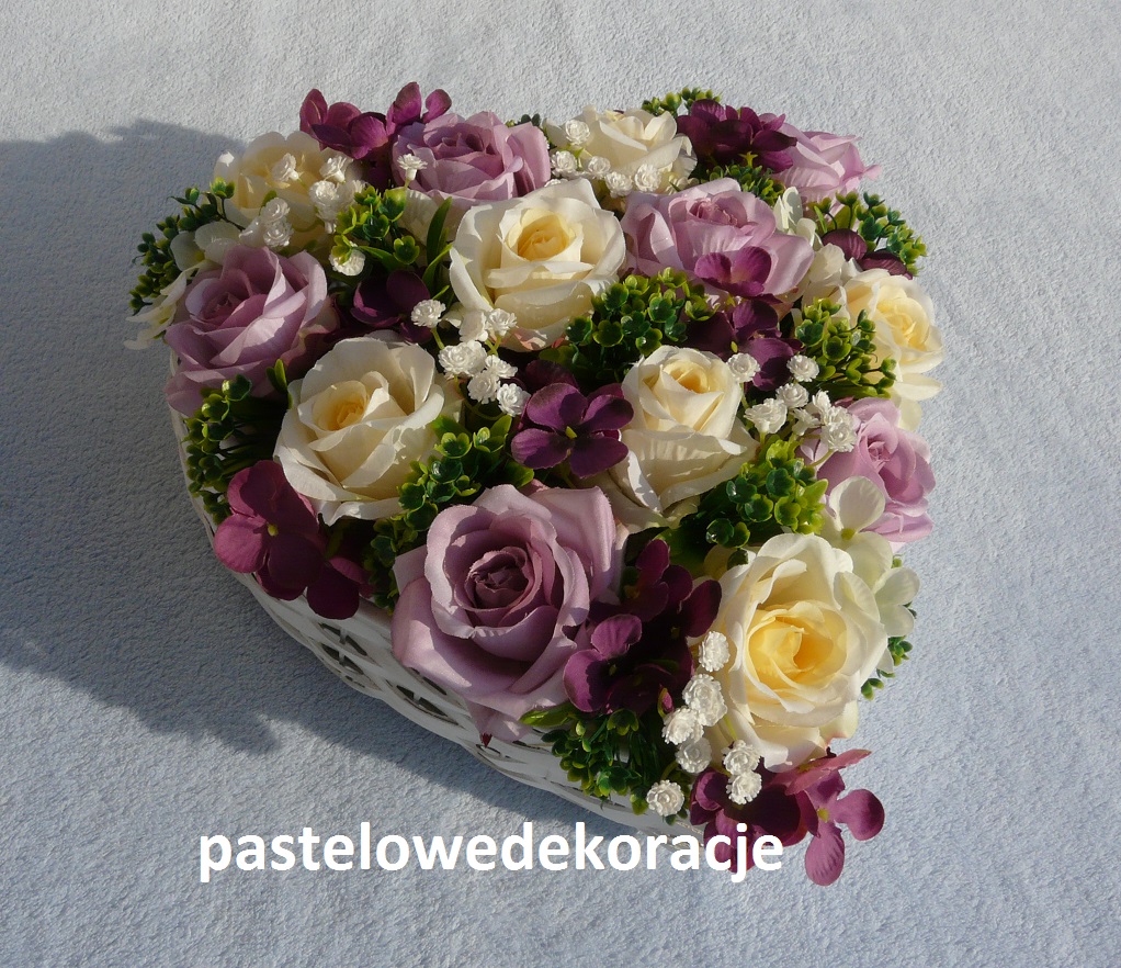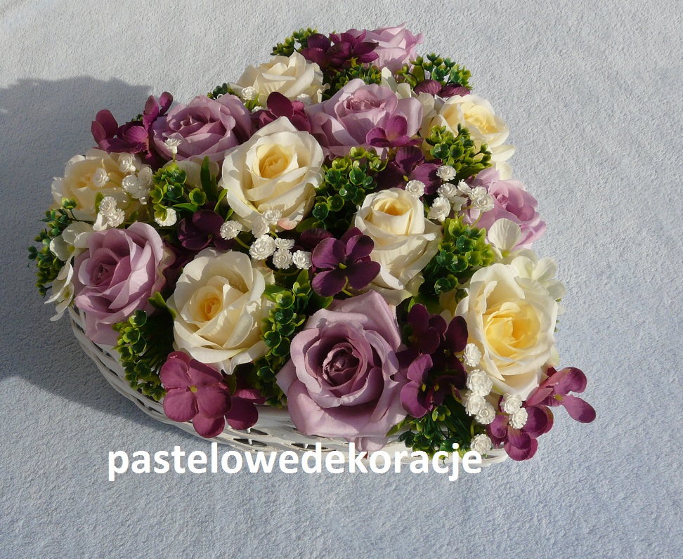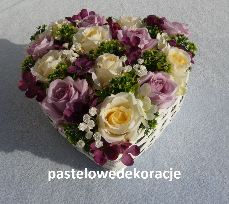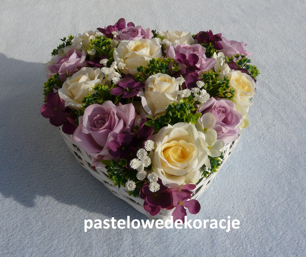 Dekoracja nagrobna wykonana w ratanowym sercu z gipsowym obciążeniem, co zapewnia jej odpowiednią stabilność na nagrobku. Kompozycja została wykonana z wysokiej jakości kwiatów sztucznych oraz zielonych dodatków (róże, hortensja, gipsówka). Wymiary kompozycji: długość 30 cm, szerokość 31 cm, wysokość 17 cm.