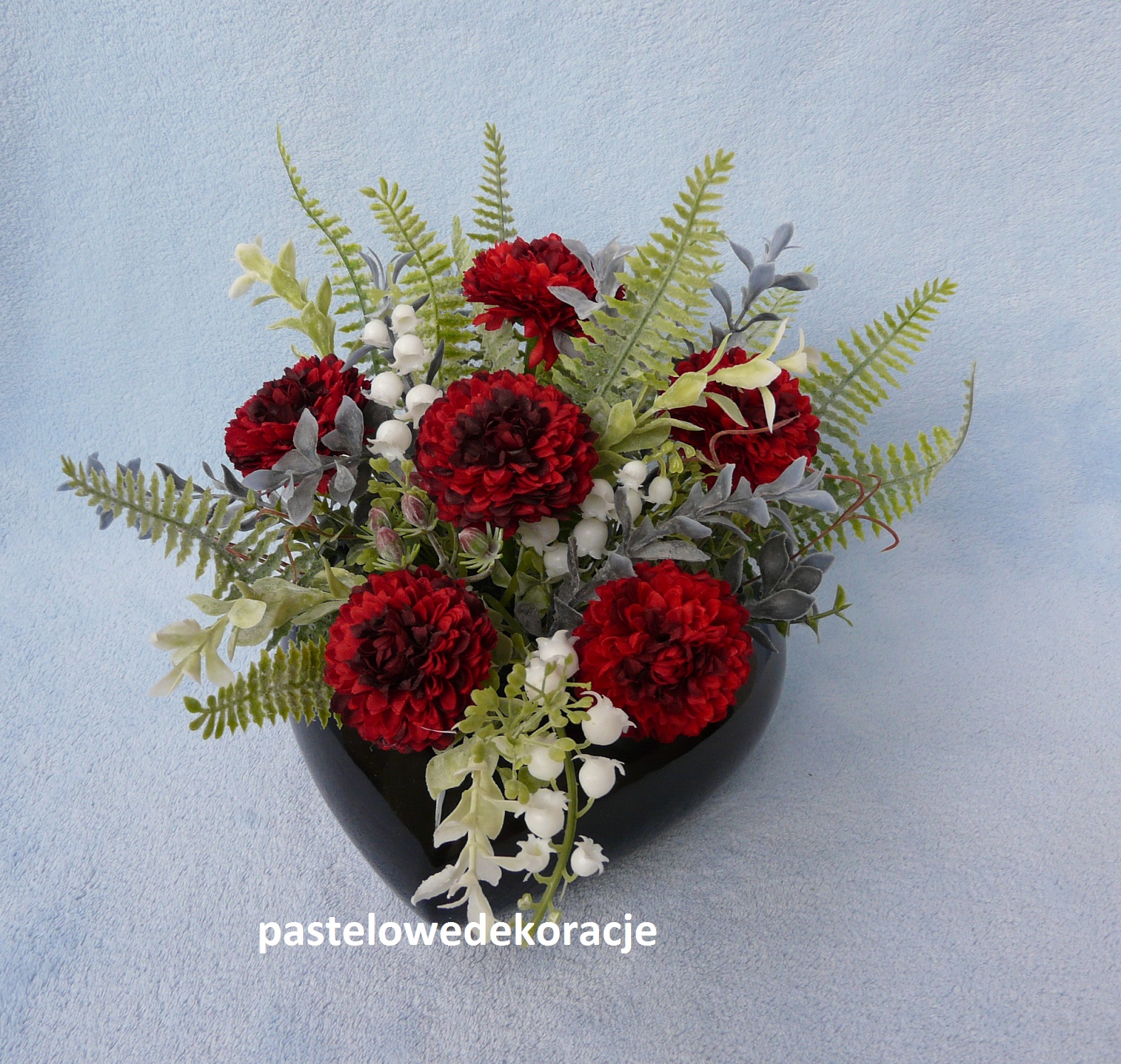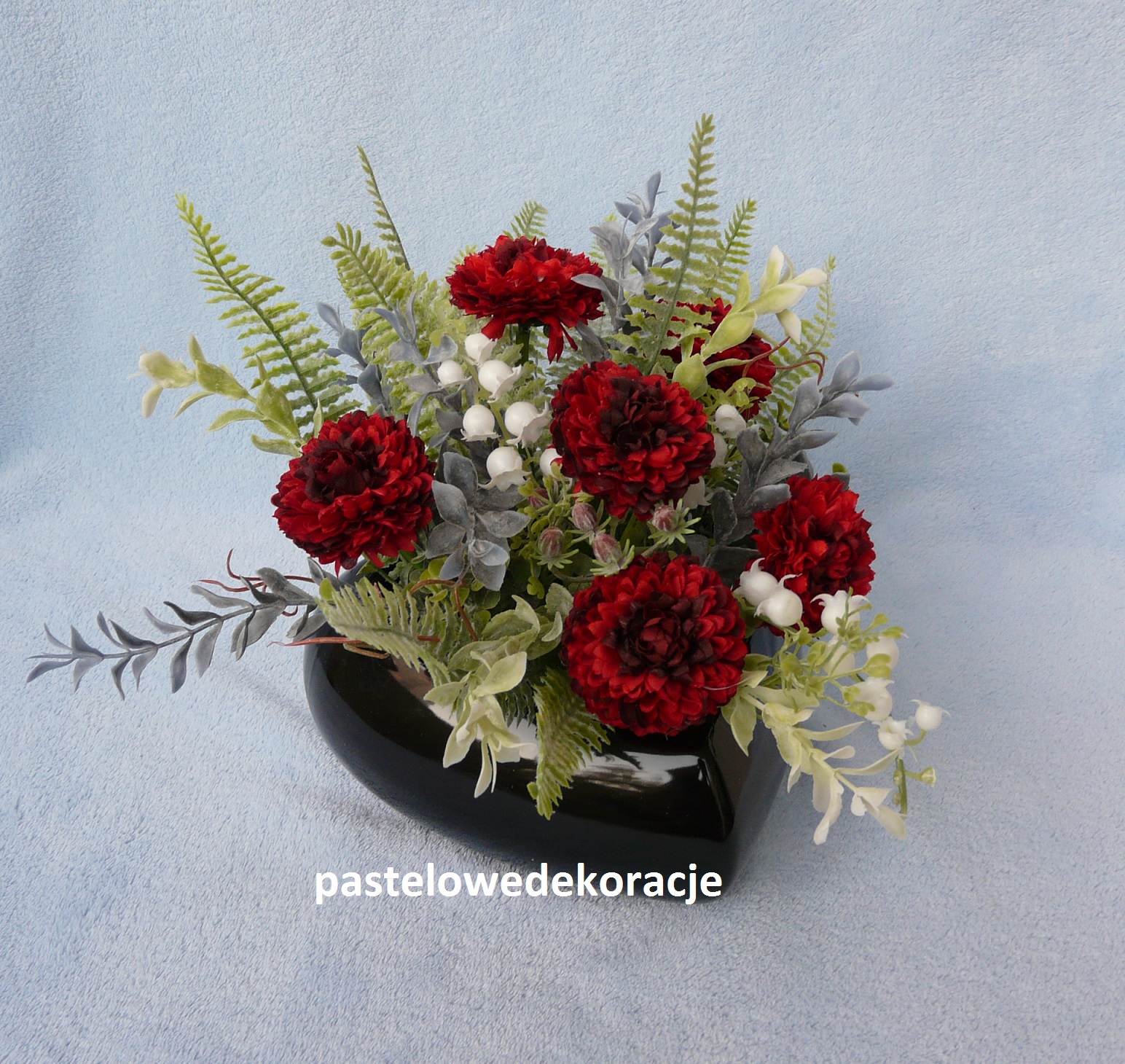 Dekoracja – stroik wykonany w stabilnym lakierowanym czarnym sercu z astrami i innymi dodatkami.