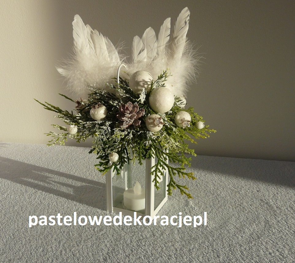 Lampion z tea lightem z baterią w zestawie, ozdobiony skrzydłami z piór i białymi świątecznymi dodatkami. Wymiary 20 x 24 cm. Do użytku wewnątrz jak i na zewnątrz, np. na nagrobek.