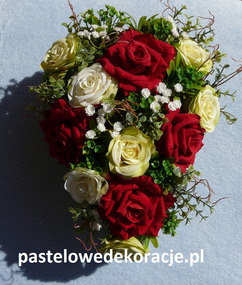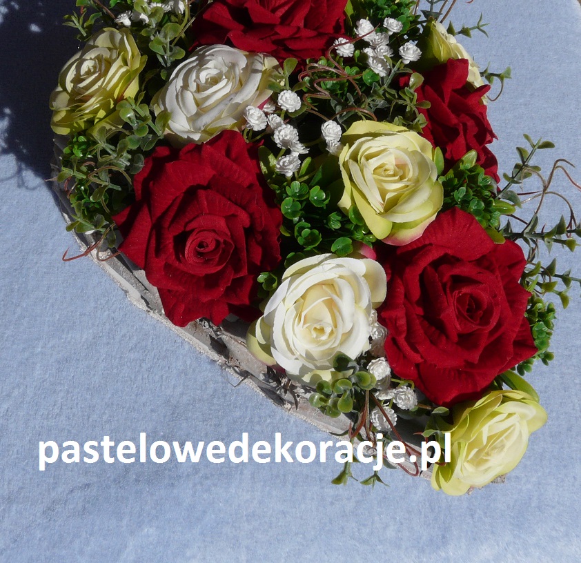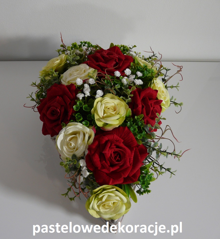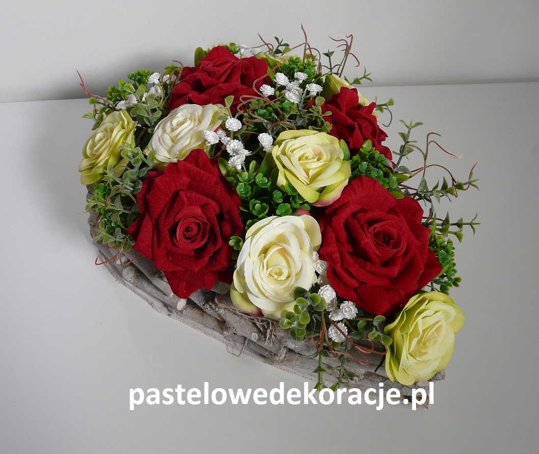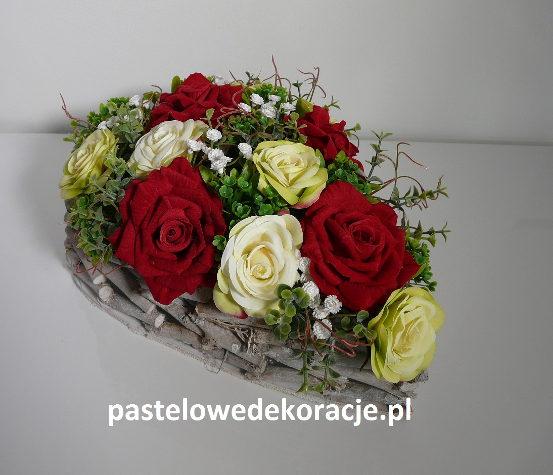 Dekoracja wykonana w pojemniku z obciążeniem z gałązek (patyków) z drewnianą podstawą w kształcie serca z kwiatami w kolorze czerwonym i zielono-kremowym z białą gipsówką. Wymiary dekoracji 32x24x16 cm.