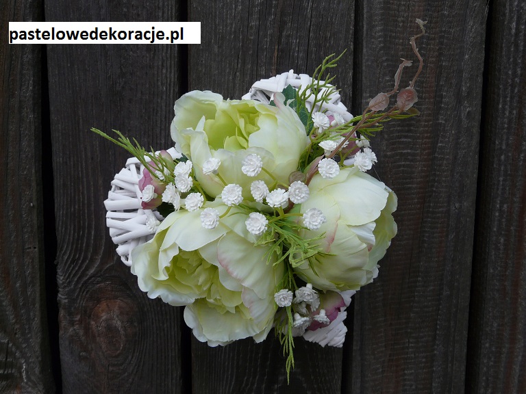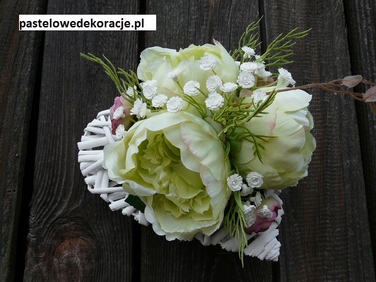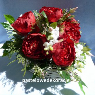 Dekoracja na ratanowym sercu o średnicy 20 cm z wysokiej jakości peoniami i jaskrami. Może stanowić zarówno dekorację do położenia w domu czy na nagrobku jak i do powieszenia.
