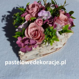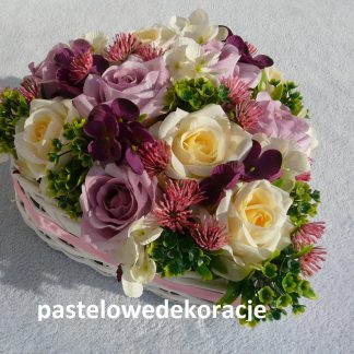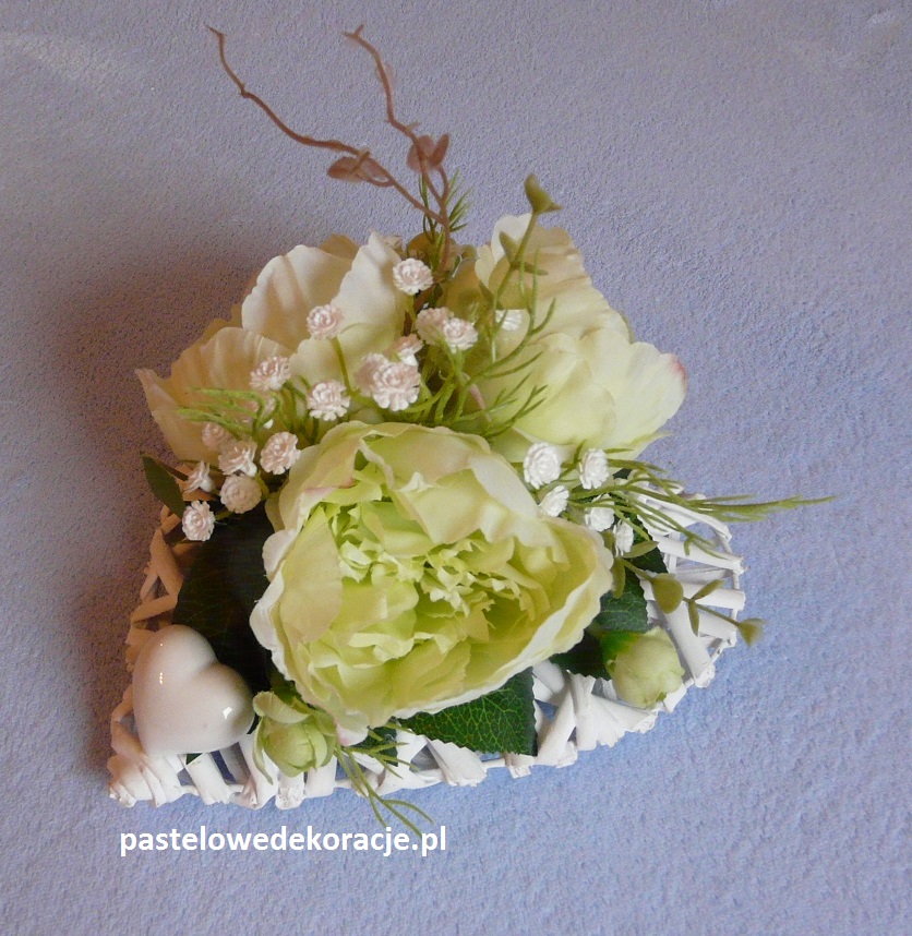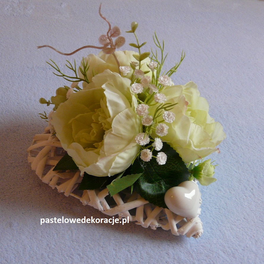 Dekoracja na ratanowym sercu o średnicy 20 cm z wysokiej jakości peoniami. Może stanowić zarówno dekorację do położenia w domu czy na nagrobku jak i do powieszenia.