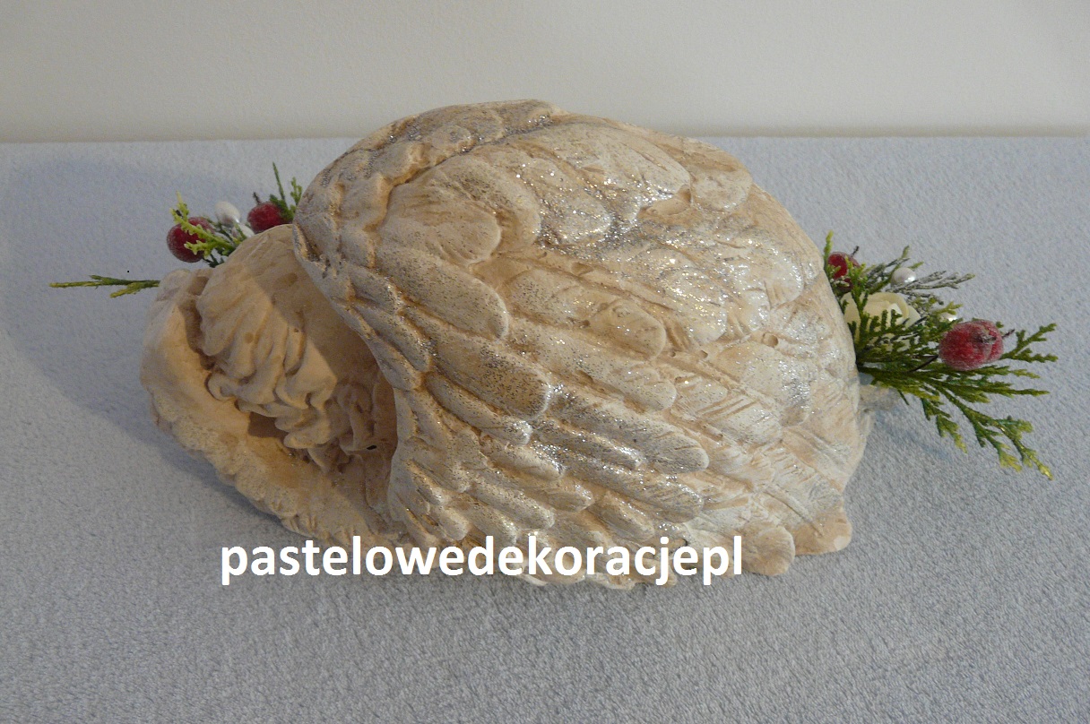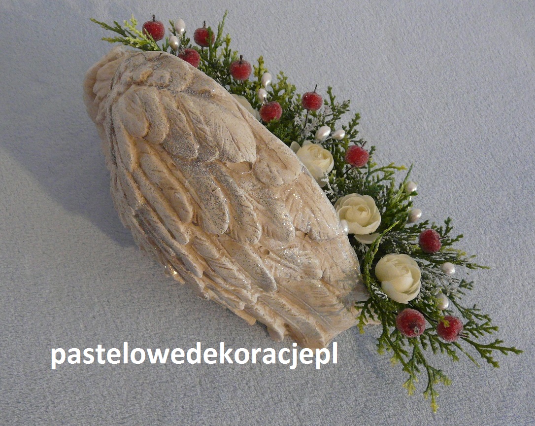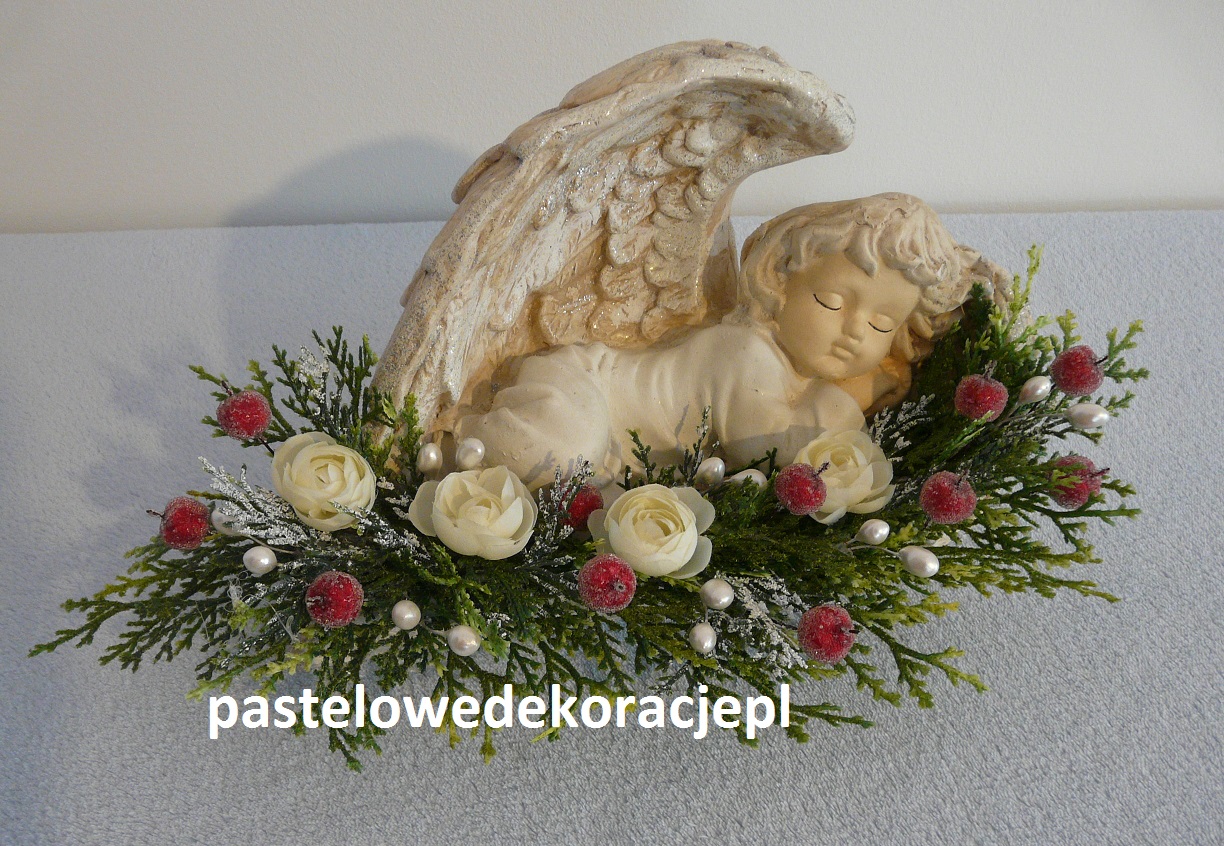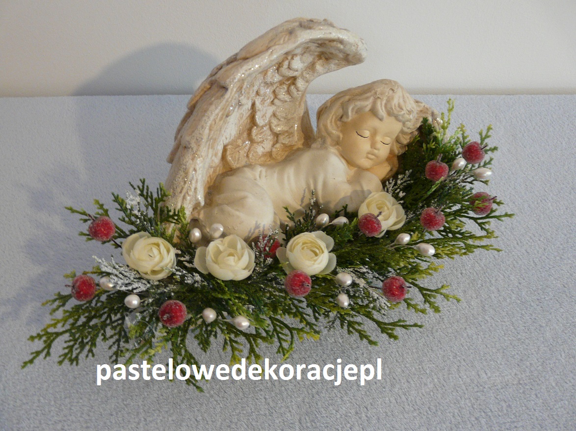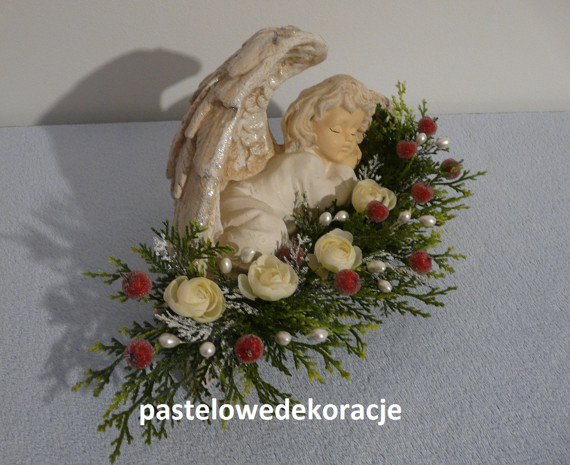 Dekoracja – gipsowy malowany anioł z brokatem ozdobiony sztucznymi gałązkami i dodatkami w klimacie Bożego Narodzenia.